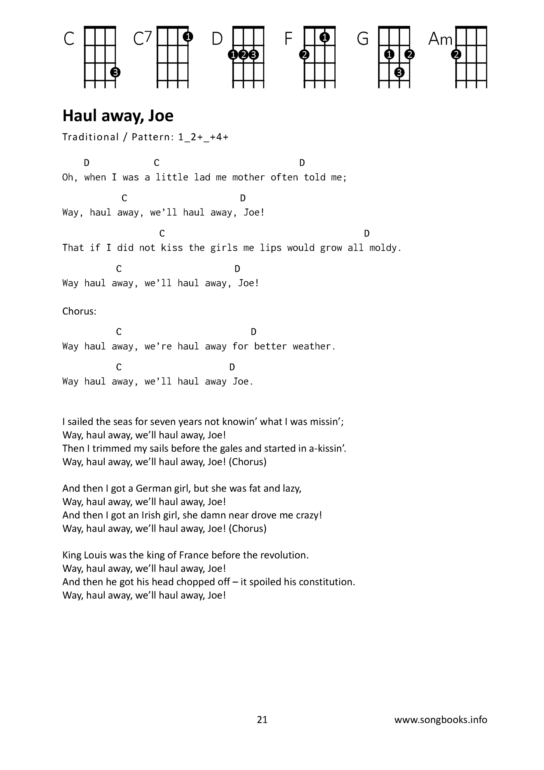 Die Ukulele – Griffbilder dieser 6 Akkorde sind auf jeder Seite oben ersichtlich. Die Namen der Akkorde stehen über dem Liedtext, so ist sofort klar wann welcher Akkord zu spielen ist.