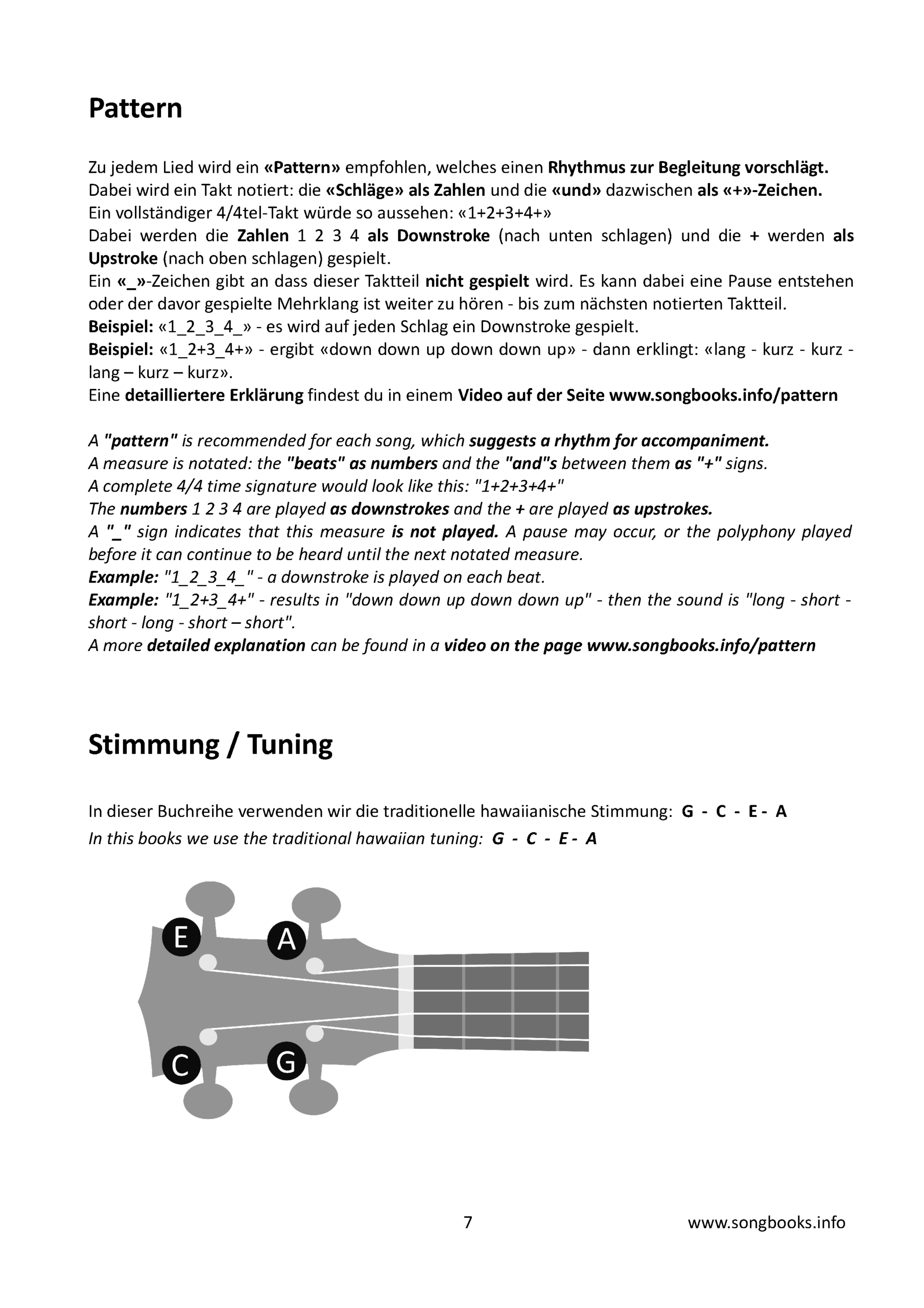 Zu jedem Lied ist ein „Pattern“ notiert – ein Vorschlag für die Rhythmik in der Begleitung.