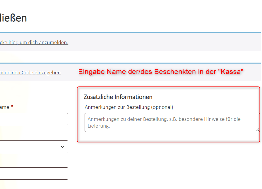 Der Gutschein wird personalisiert, daher bitte unbedingt den Namen der/des Beschenkten angeben: Auf der Seite „Kasse“ läßt sich eine „Anmerkung zur Bestellung“ (rechts bzw. unterhalb der Rechnungsdetails) eingeben. Hier bitte den gewünschten Namen angeben.
